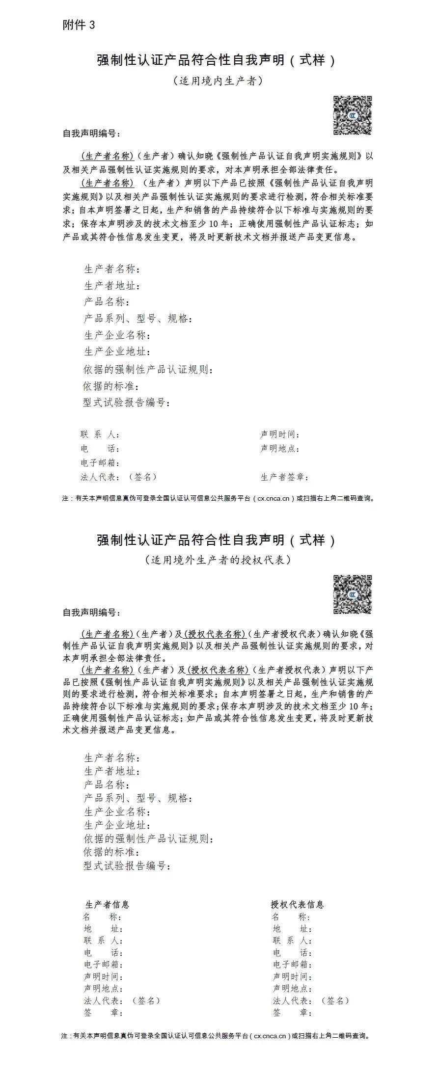 适用强制性产品认证自我声明评价方式的产品,只能采用自我声明评价方式,不再发放强制性产品认证证书。企业应依据《强制性产品认证自我声明实施规则》要求完成自我评价,在“自我声明符合性信息报送系统”(http://sdoc.cnca.cn)报送产品符合性信息,并对产品加施强制性产品认证标志后,方可出厂、销售、进口或者在其他经营活动中使用。产品符合性信息报送成功后,系统生成“强制性认证产品符合性自我声明”(式样见附件3)视同获得强制性产品认证证书,后续监督管理要求相同。