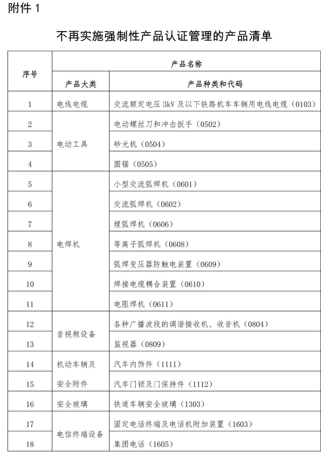 自本公告发布之日起,对18种产品(见附件1)不再实施强制性产品认证管理。相关指定认证机构应注销已出具的强制性产品认证证书,可根据企业意愿转为自愿性产品认证证书。认监委注销相关认证机构和实验室所涉及的强制性产品认证指定业务范围。
