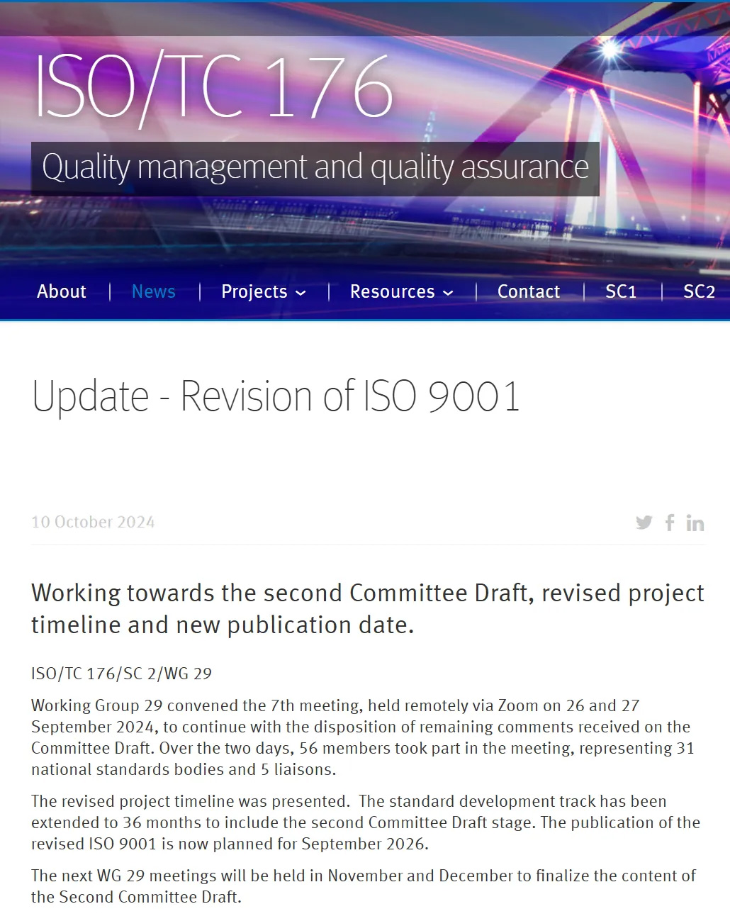 近日,ISO/TC176发布最新消息,新版IS09001计划将于2026年9月发布。